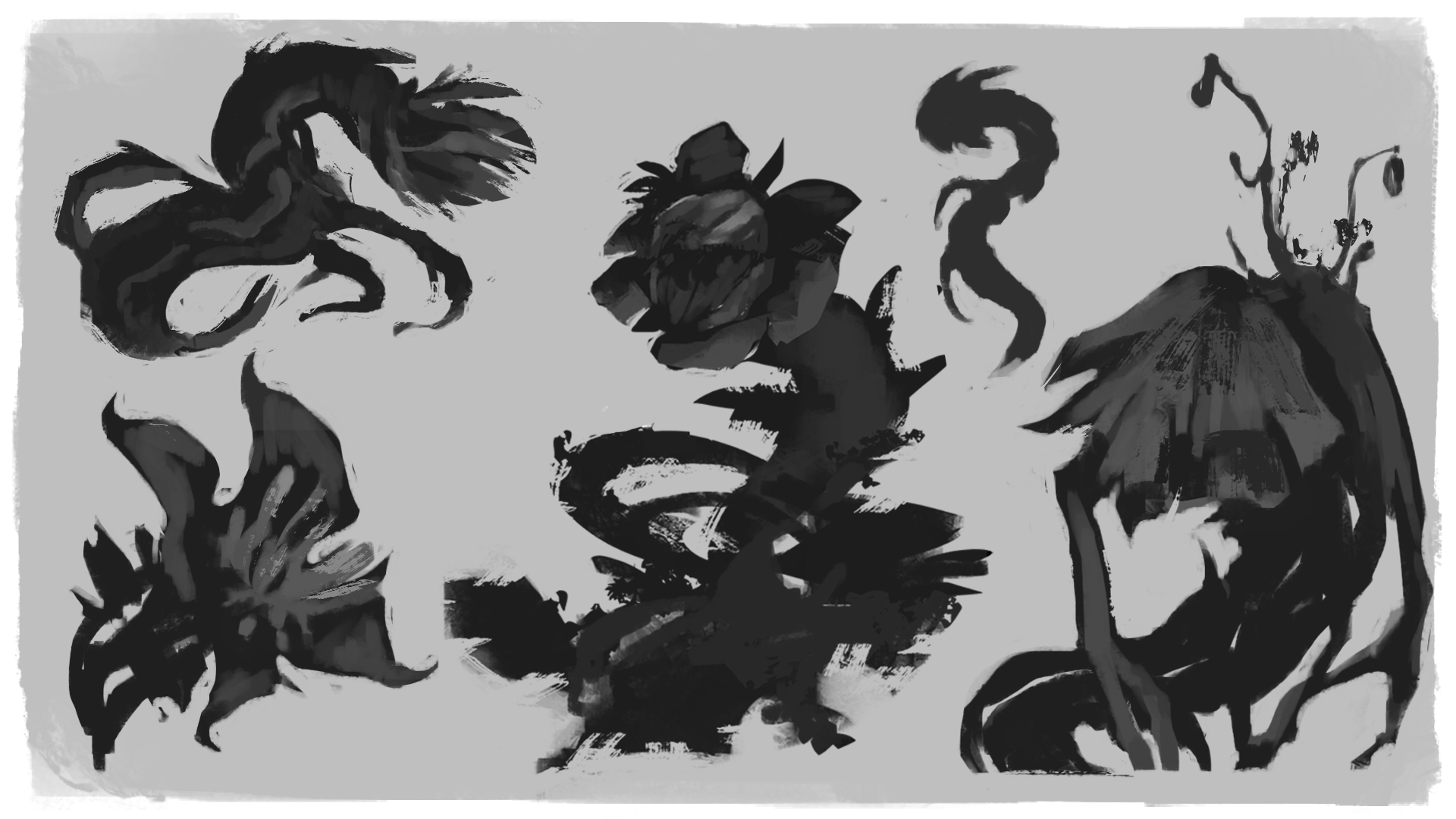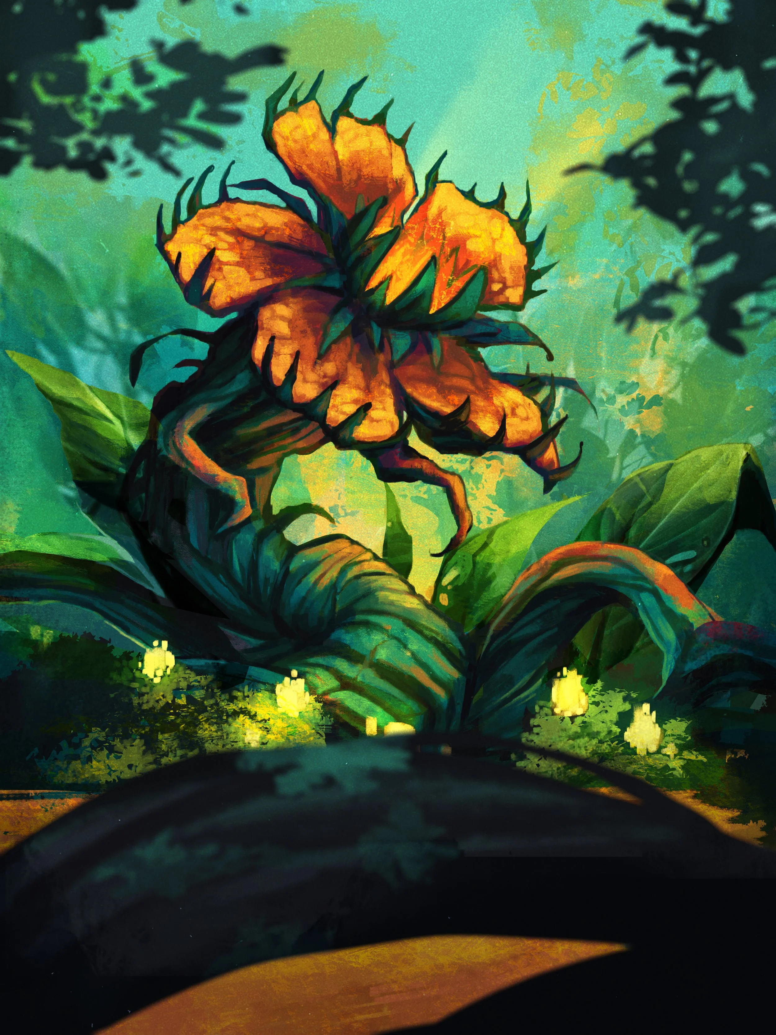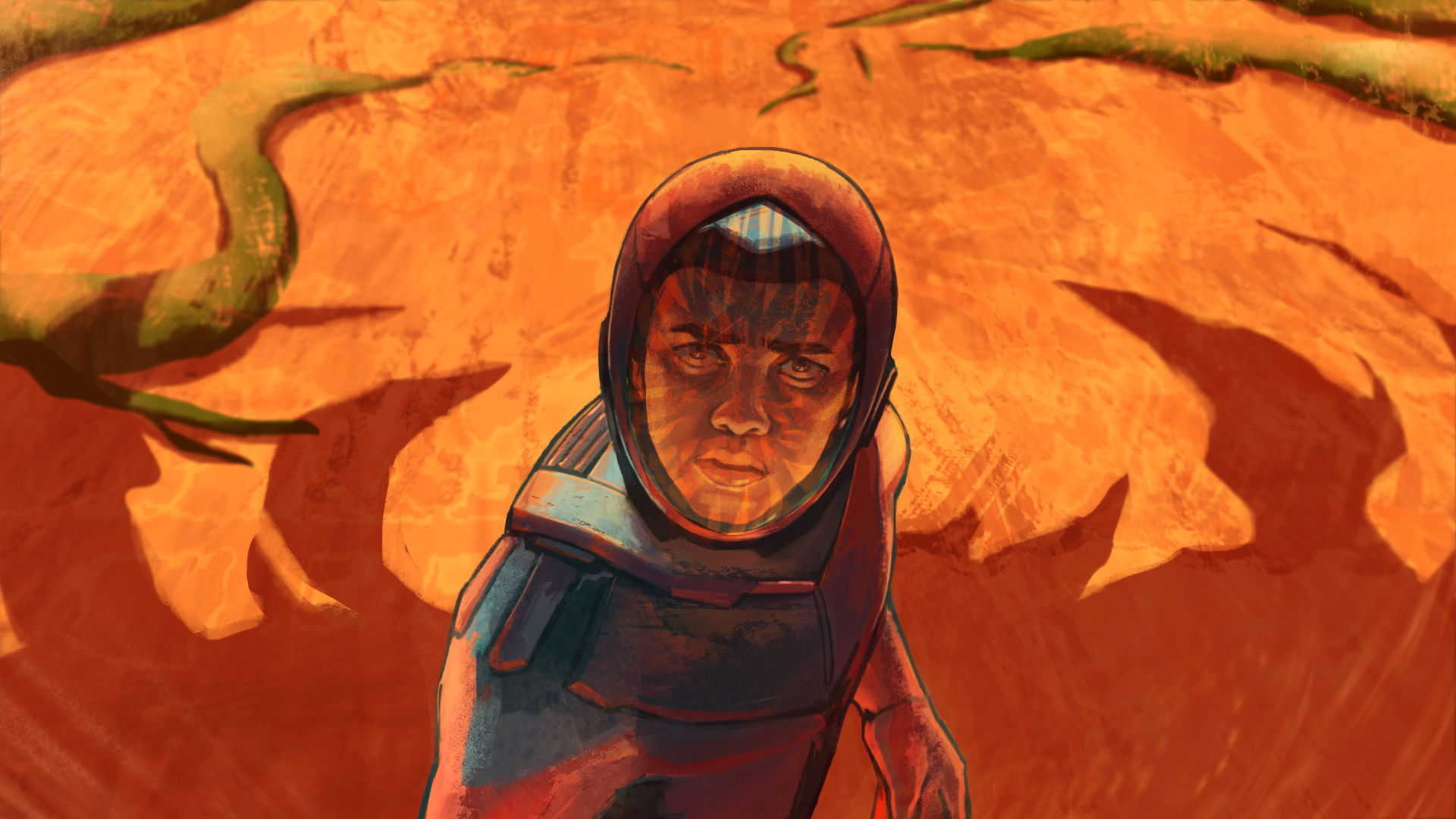 Concept art acting as a snapshot frame of the animation when the biologist discovers the monster.